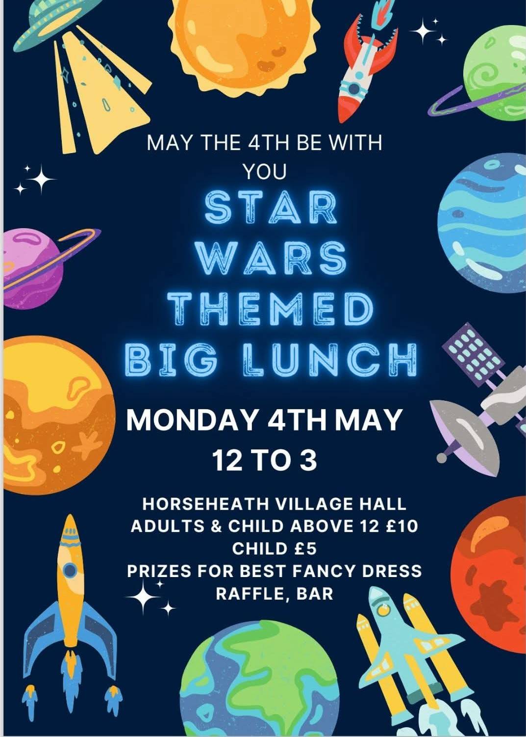 Come and enjoy a wonderful lunch in the Village Hall. Come dressed as your favourite Star Wars or space character - prizes for the best Fancy Dress!